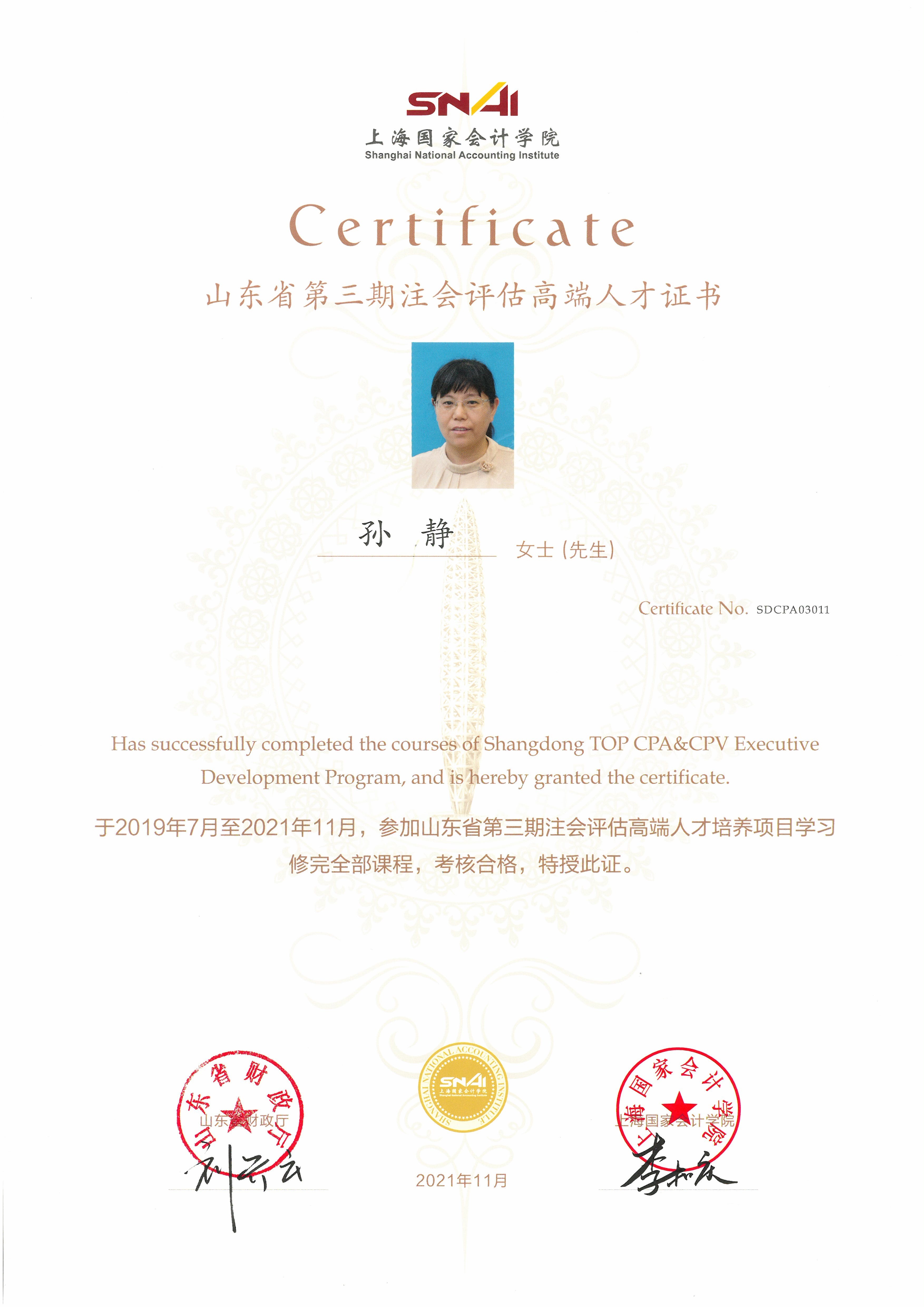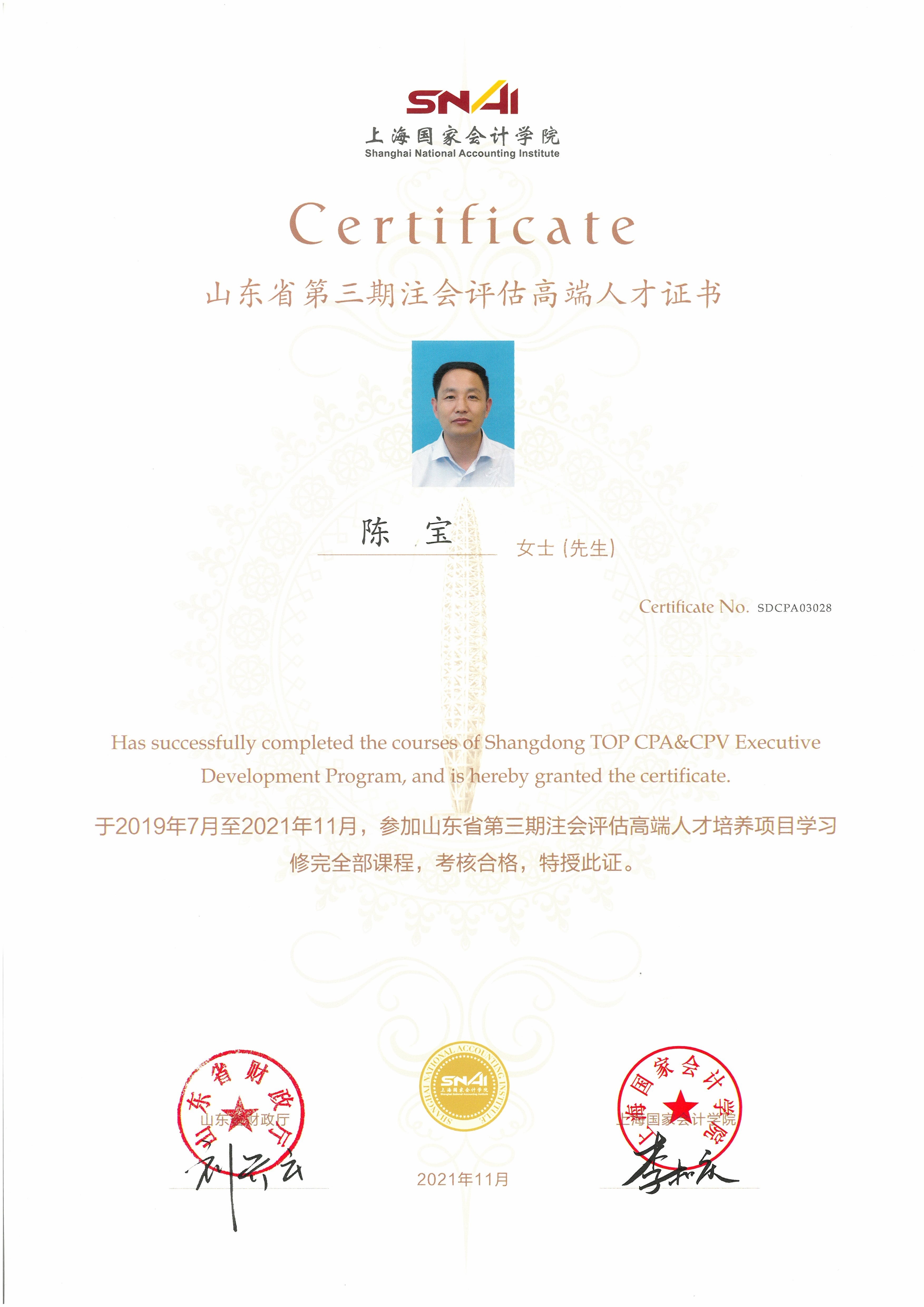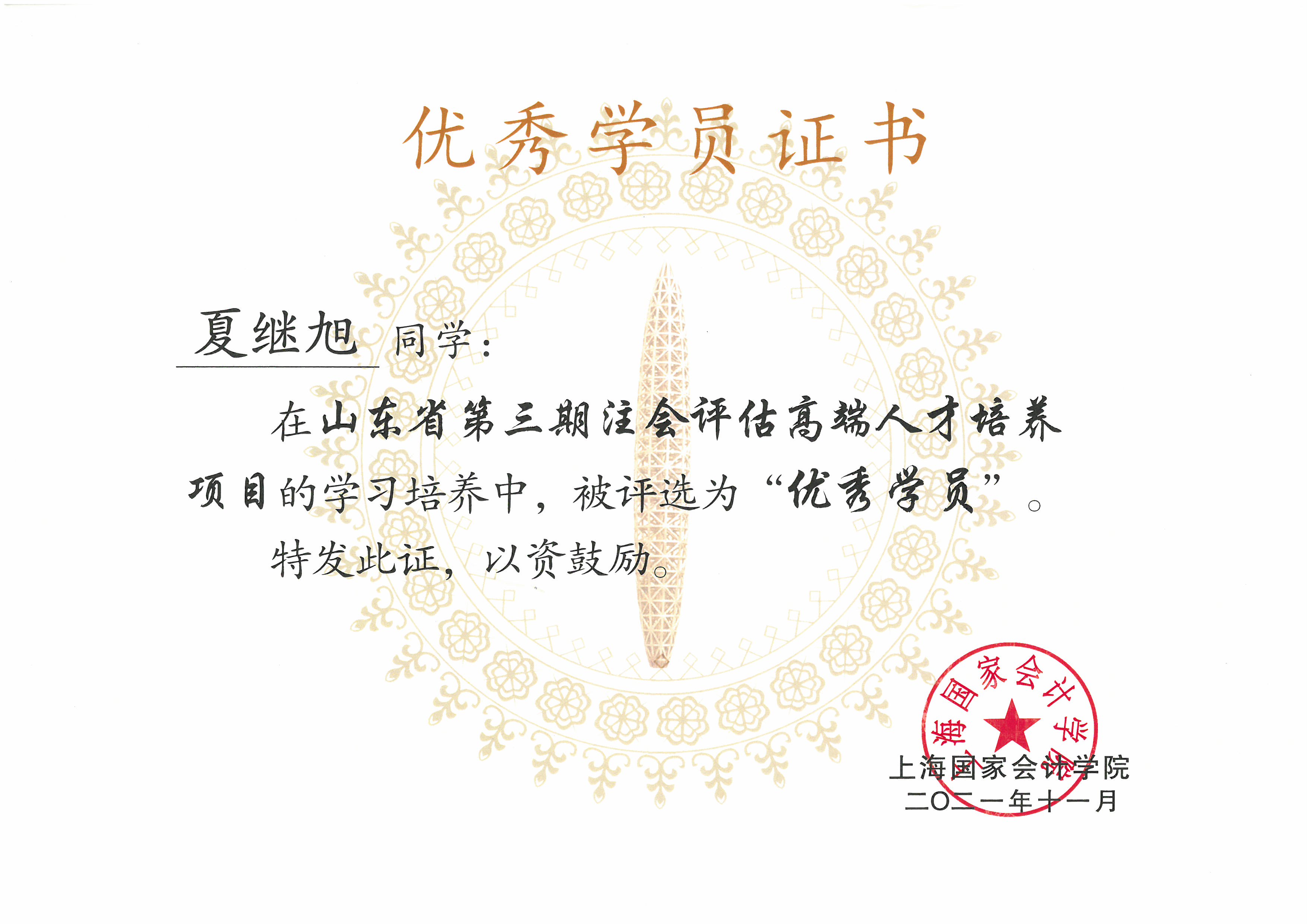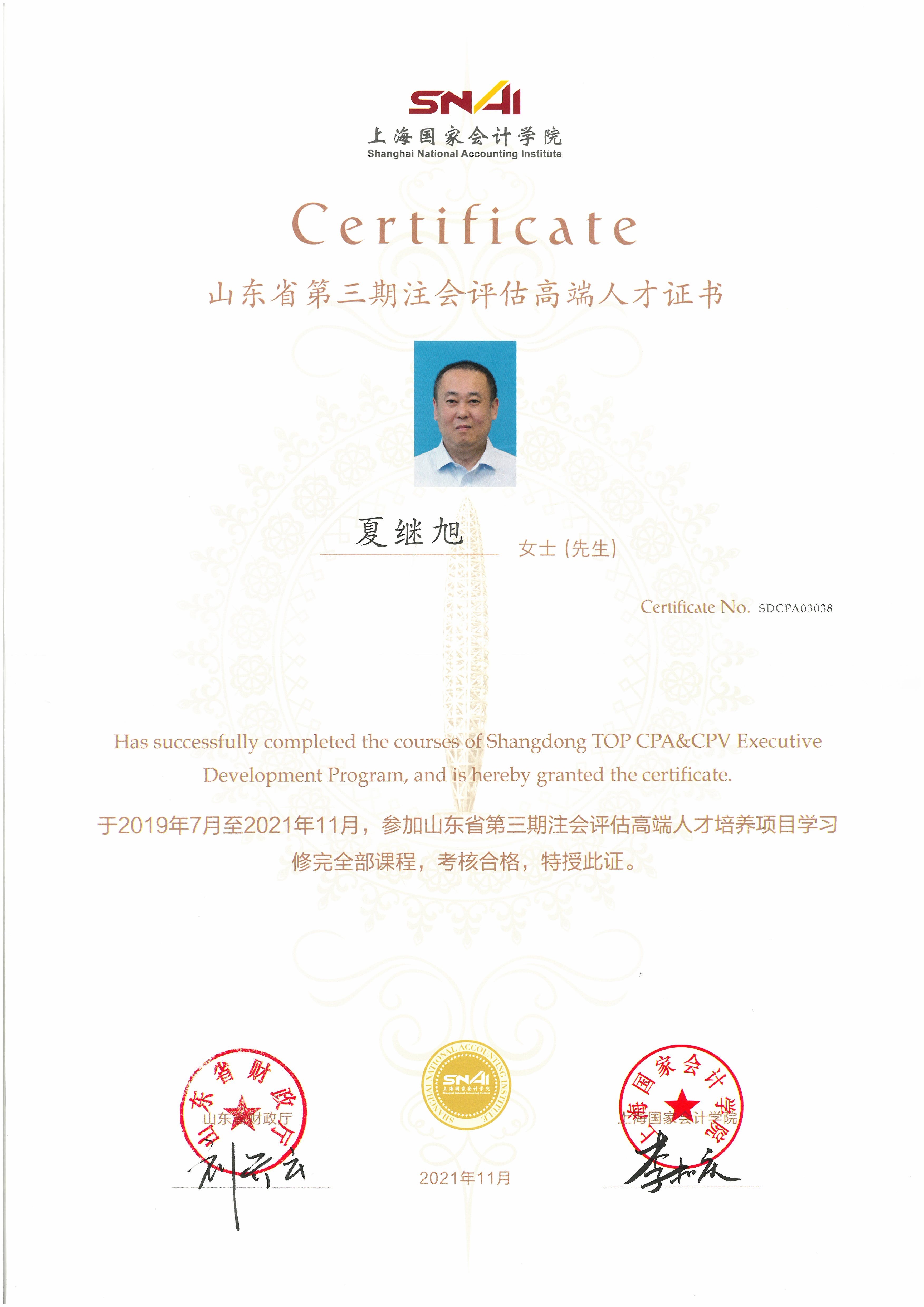 近日,山東省第三期注會評估高端人才畢業(yè)典禮在上海國家會計學(xué)院圓滿舉行。省財政廳、省注協(xié)和上海國家會計學(xué)院領(lǐng)導(dǎo)出席畢業(yè)典禮并講話,省注協(xié)秘書長梁仕念通過視頻方式對第三期高端班的學(xué)員們表示熱烈的祝賀,向全體高端人才送上美好祝愿,寄予殷切期望。 我事務(wù)所陳寶、夏繼旭、孫靜三名同志經(jīng)嚴(yán)格考核選拔為第三期高端人才培訓(xùn)人選,參加了為期三年的培訓(xùn),交出了一份出色的成績單,正式成為省高端人才,夏繼旭同志被評為優(yōu)秀學(xué)員。