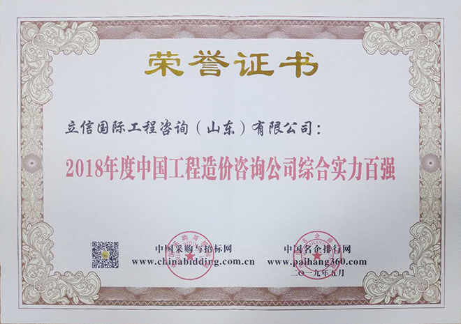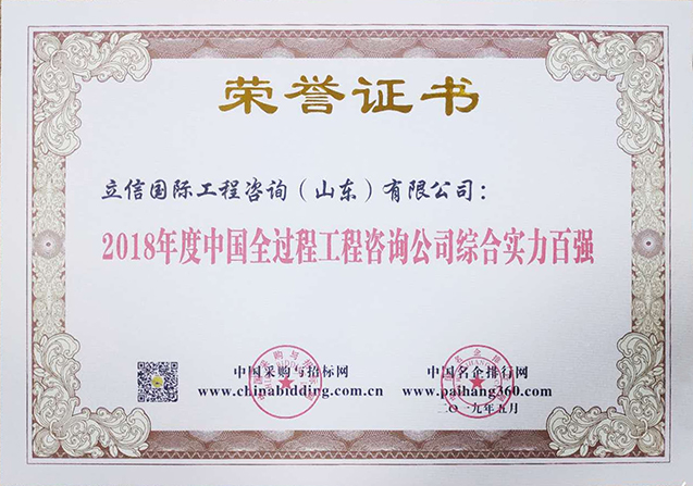 2019年5月,在“2019第13屆全國招投標(biāo)領(lǐng)域年度聚焦暨全過程工程咨詢機(jī)構(gòu)評(píng)價(jià)推介”活動(dòng)中,立信國際工程咨詢(山東)有限公司獲得如下榮譽(yù):