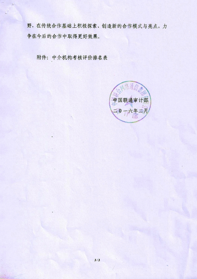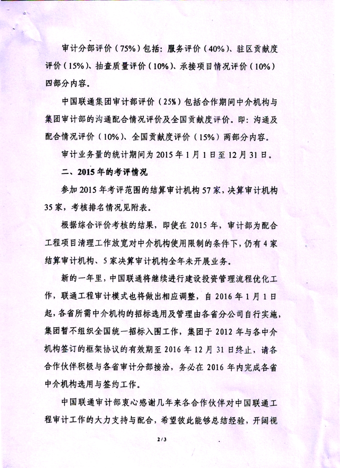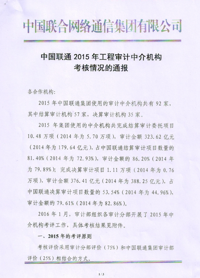 | 關(guān)于中國聯(lián)通2015年工程審計中介機構(gòu)考核情況的通報 | |