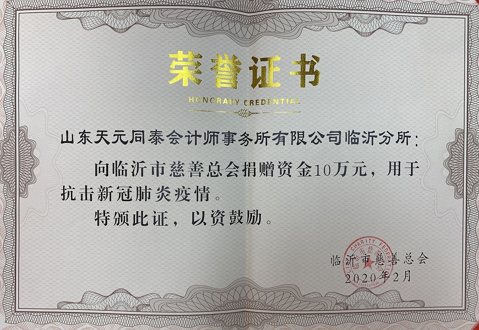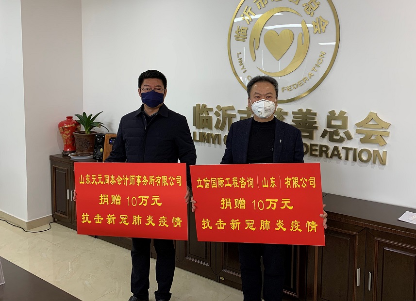 防控疫情,人人有責(zé)。在抗擊新冠肺炎關(guān)鍵時(shí)期,全體同泰人與全國人民同呼吸、共命運(yùn),特向臨沂市慈善總會(huì)捐款專項(xiàng)用于防控新冠肺炎,以表達(dá)同泰人疫情面前共擔(dān)當(dāng)?shù)臎Q心和信心。其中山東天元同泰會(huì)計(jì)師事務(wù)所臨沂分所捐款10萬元,立信國際工程咨詢(山東)有限公司捐款10萬元,合計(jì)20萬元整。