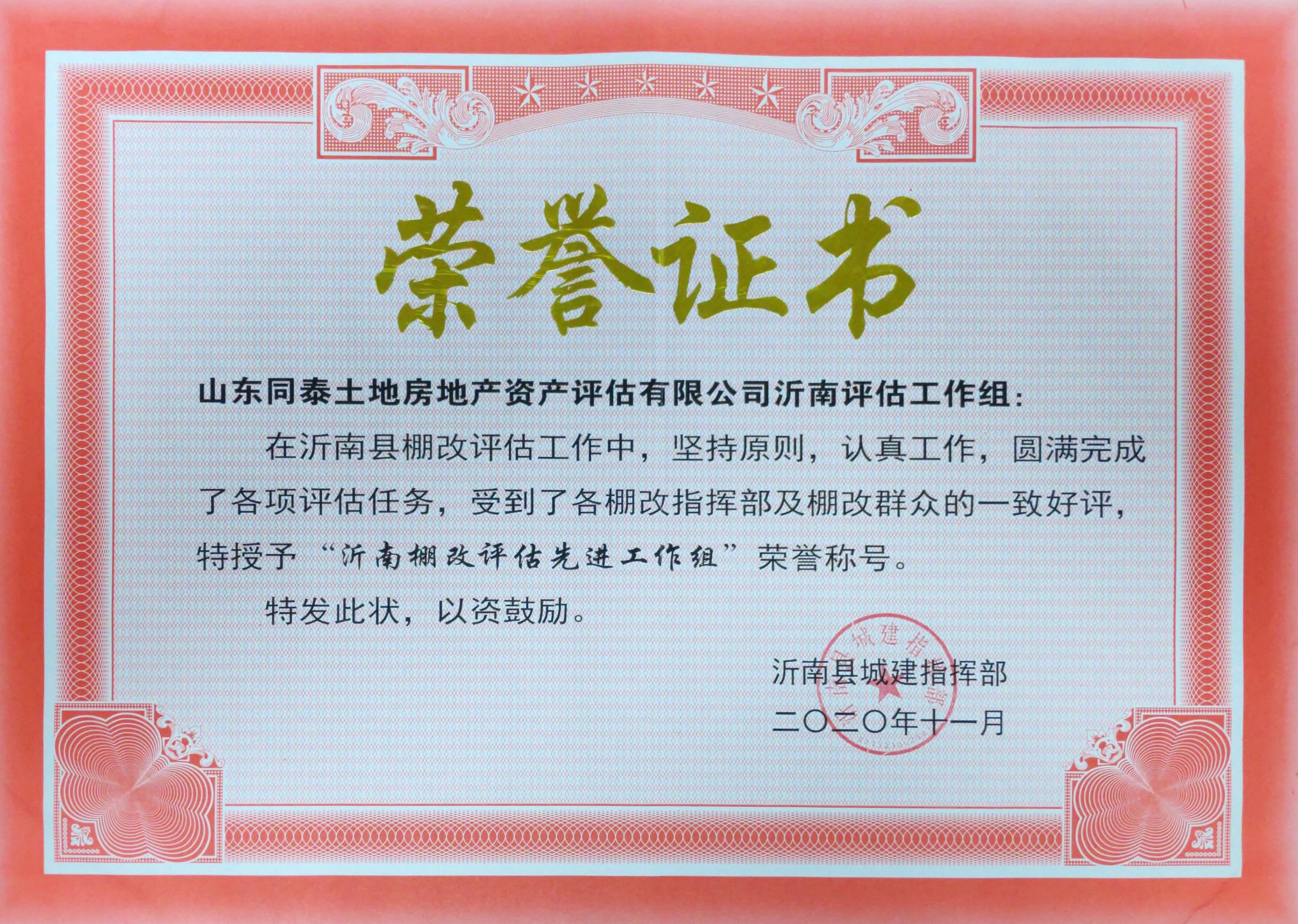 | 喜報(bào) | 同泰評(píng)估獲“沂南棚改評(píng)估先進(jìn)工作組”等榮譽(yù)稱號(hào) |