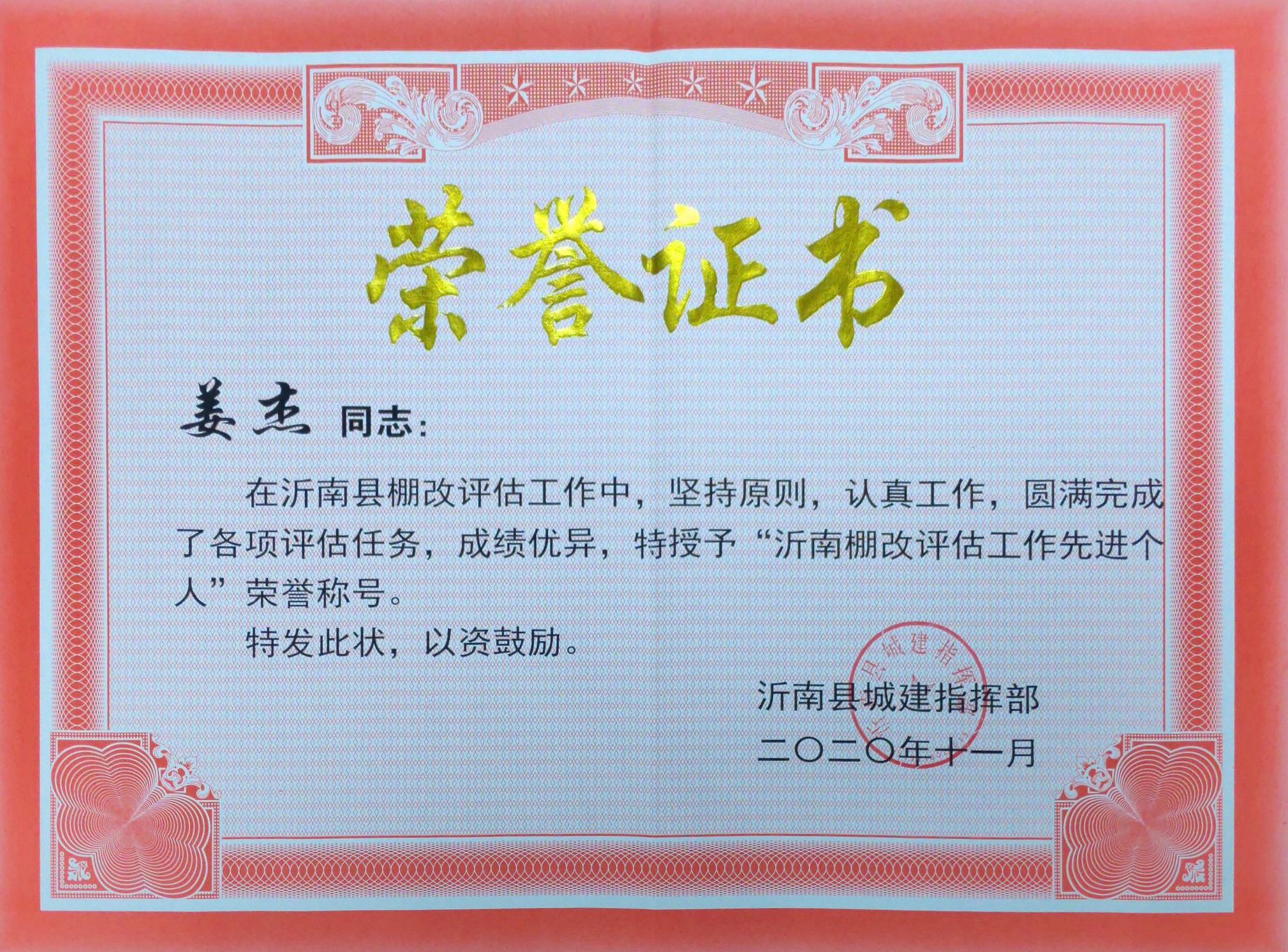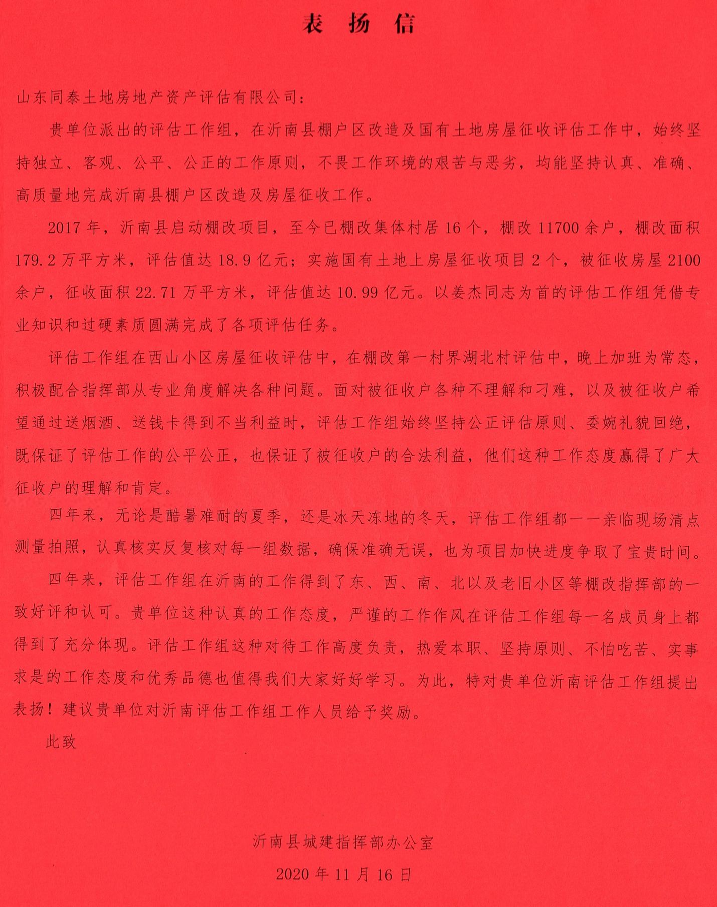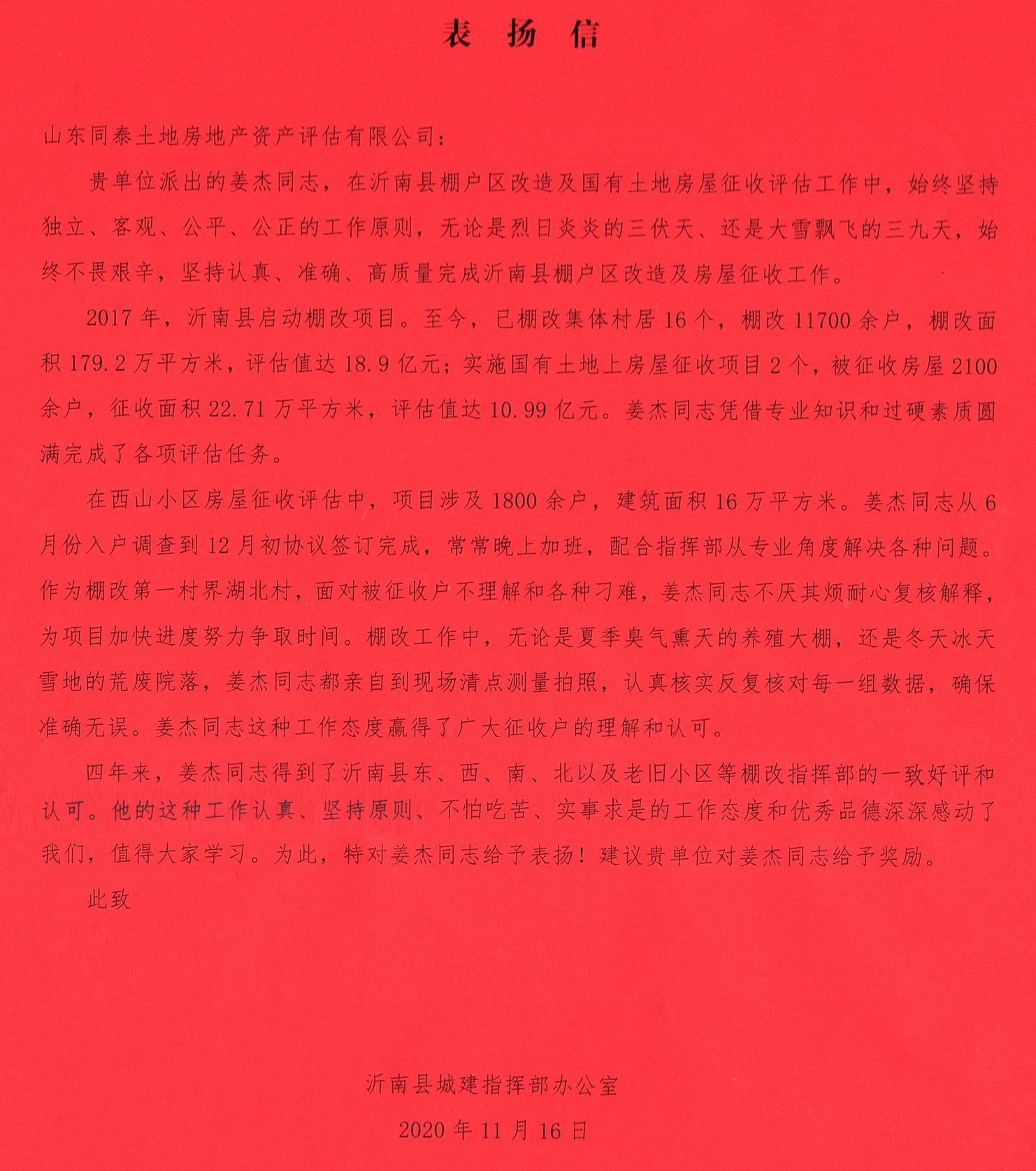 表揚(yáng)信 山東同泰土地房地產(chǎn)資產(chǎn)評(píng)估有限公司: 貴單位派出的姜杰同志,在沂南縣棚戶區(qū)改造及國有土地房屋征收評(píng)估工作中,始終堅(jiān)持獨(dú)立、客觀、公平、公正的工作原則,無論是烈日炎炎的三伏天、還是大雪飄飛的三九天,始終不畏艱辛,堅(jiān)持認(rèn)真、準(zhǔn)確、高質(zhì)量完成沂南縣棚戶區(qū)改造及房屋征收工作。 2017年,沂南縣啟動(dòng)棚改項(xiàng)目。至今,已棚改集體村居16個(gè),棚改11700余戶,棚改面積179.2萬平方米,評(píng)估值達(dá)18.9億元;實(shí)施國有土地上房屋征收項(xiàng)目2個(gè),被征收房屋2100余戶,征收面積22.71萬平方米,評(píng)估值達(dá)10.99億元。姜杰同志憑借專業(yè)知識(shí)和過硬素質(zhì)圓滿完成了各項(xiàng)評(píng)估任務(wù)。 在西山小區(qū)房屋征收評(píng)估中,項(xiàng)目涉及1800余戶,建筑面積16萬平方米。姜杰同志從6月份入戶調(diào)查到12月初協(xié)議簽訂完成,常常晚上加班,配合指揮部從專業(yè)角度解決各種問題。作為棚改第一村界湖北村,面對(duì)被征收戶不理解和各種刁難,姜杰同志不厭其煩耐心復(fù)核解釋,為項(xiàng)目加快進(jìn)度努力爭(zhēng)取時(shí)間。棚改工作中,無論是夏季臭氣熏天的養(yǎng)殖大棚,還是冬天冰天雪地的荒廢院落,姜杰同志都親自到現(xiàn)場(chǎng)清點(diǎn)測(cè)量拍照,認(rèn)真核實(shí)反復(fù)核對(duì)每一組數(shù)據(jù),確保準(zhǔn)確無誤。姜杰同志這種工作態(tài)度贏得了廣大征收戶的理解和認(rèn)可。 四年來,姜杰同志得到了沂南縣東、西、南、北以及老舊小區(qū)等棚改指揮部的一致好評(píng)和認(rèn)可。他的這種工作認(rèn)真、堅(jiān)持原則、不怕吃苦、實(shí)事求是的工作態(tài)度和優(yōu)秀品德深深感動(dòng)了我們,值得大家學(xué)習(xí)。為此,特對(duì)姜杰同志給予表揚(yáng)!建議貴單位對(duì)姜杰同志給予獎(jiǎng)勵(lì)。 此致沂南縣城建指揮部辦公室 2020年11月16日