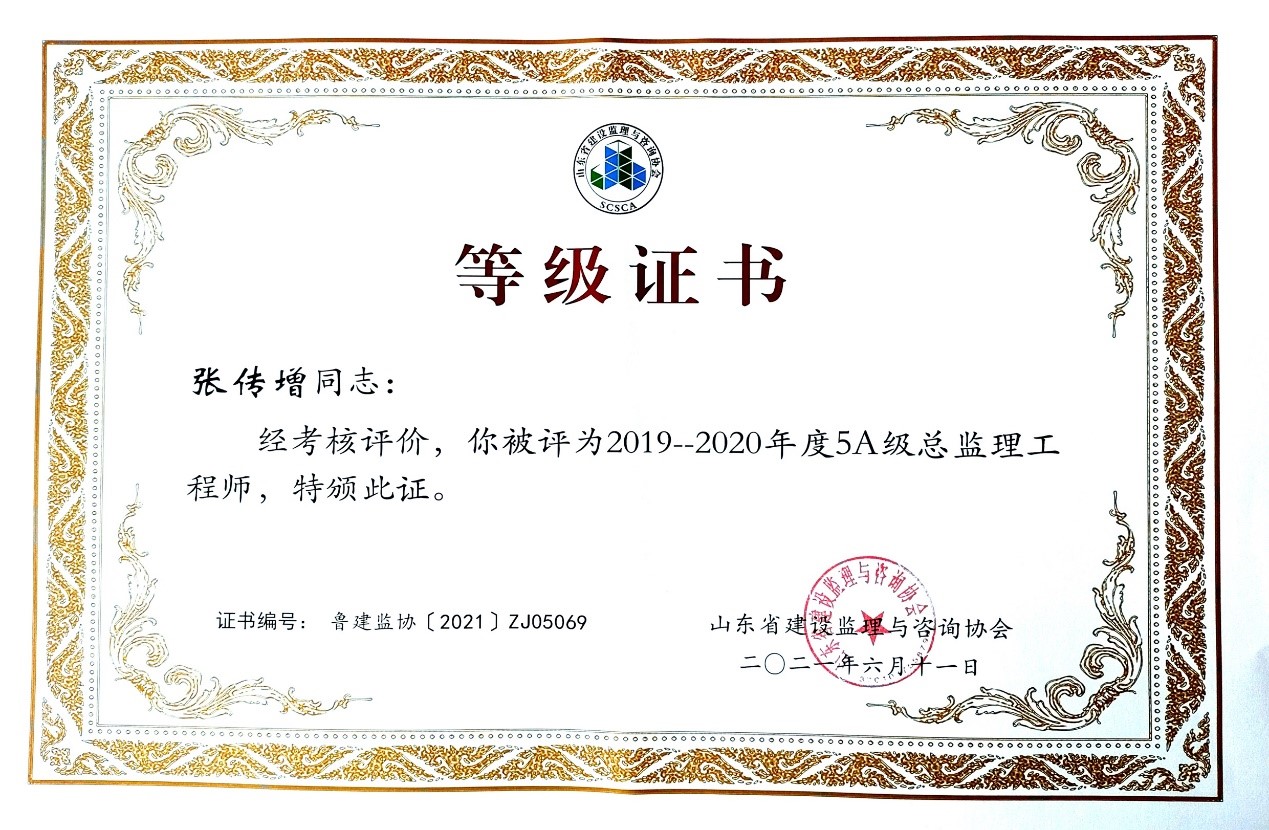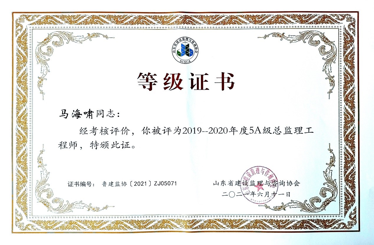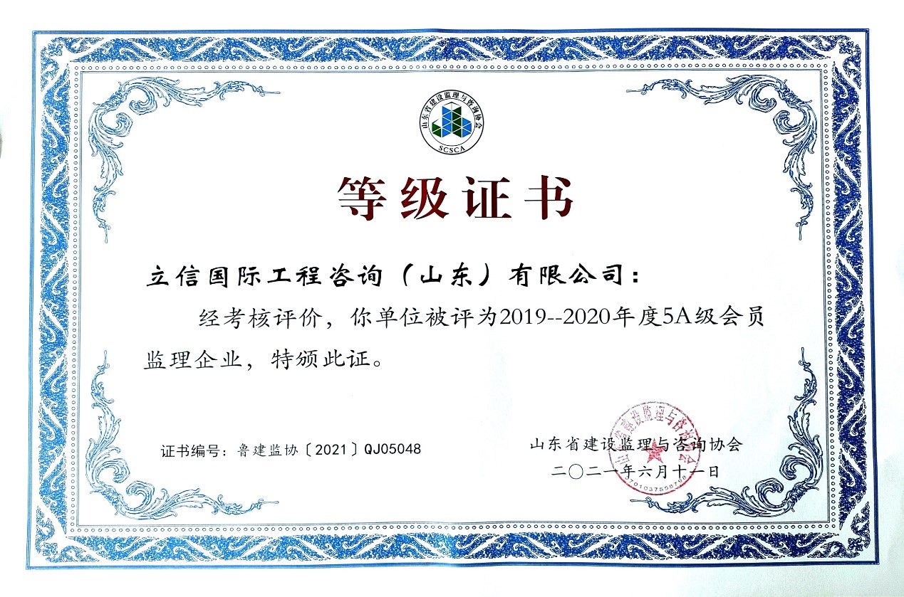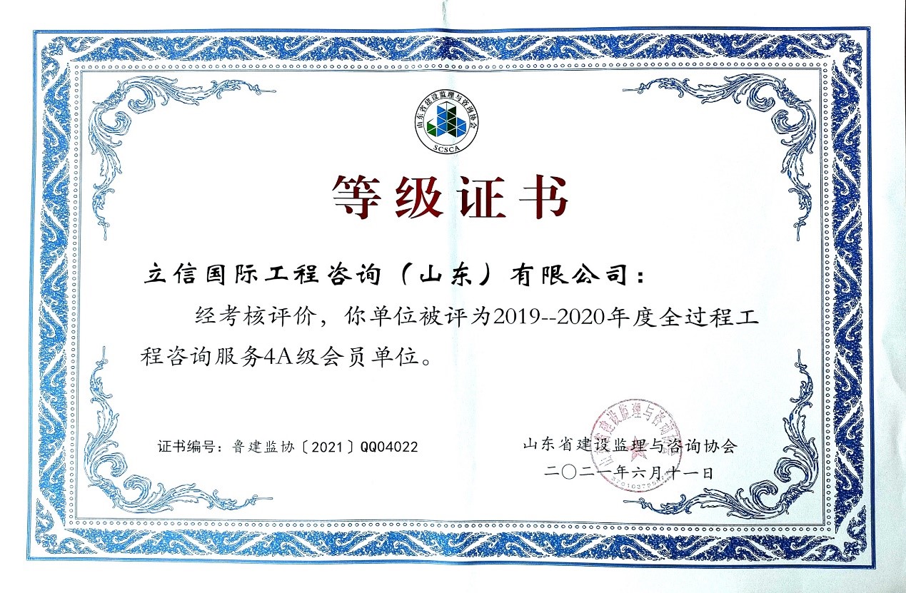 2021年6月,山東省建設(shè)監(jiān)理與咨詢協(xié)會(huì)、臨沂市建設(shè)監(jiān)理協(xié)會(huì)分別開展了有關(guān)全過程咨詢服務(wù)、監(jiān)理等業(yè)務(wù)的各項(xiàng)綜合考評(píng),立信國(guó)際工程咨詢(山東)有限公司在考評(píng)中獲得較高信用等級(jí)。 在山東省建設(shè)監(jiān)理與咨詢協(xié)會(huì)開展的2019-2020年度全過程咨詢服務(wù)業(yè)務(wù)會(huì)員單位考核評(píng)價(jià)工作中,我公司被評(píng)選為山東省首批5A級(jí)會(huì)員監(jiān)理企業(yè)、5A級(jí)會(huì)員招標(biāo)代理機(jī)構(gòu)、4A級(jí)全過程工程咨詢服務(wù)會(huì)員單位。 我公司員工多人被山東省建設(shè)監(jiān)理與咨詢協(xié)會(huì)評(píng)選為2019-2020年度先進(jìn),其中,馬海嘯、張傳增被評(píng)為5A級(jí)總監(jiān)理工程師,高宏、張傳增被評(píng)為5A級(jí)招標(biāo)代理項(xiàng)目負(fù)責(zé)人,呂建建、彭紅運(yùn)被評(píng)為4A級(jí)招標(biāo)代理項(xiàng)目負(fù)責(zé)人。