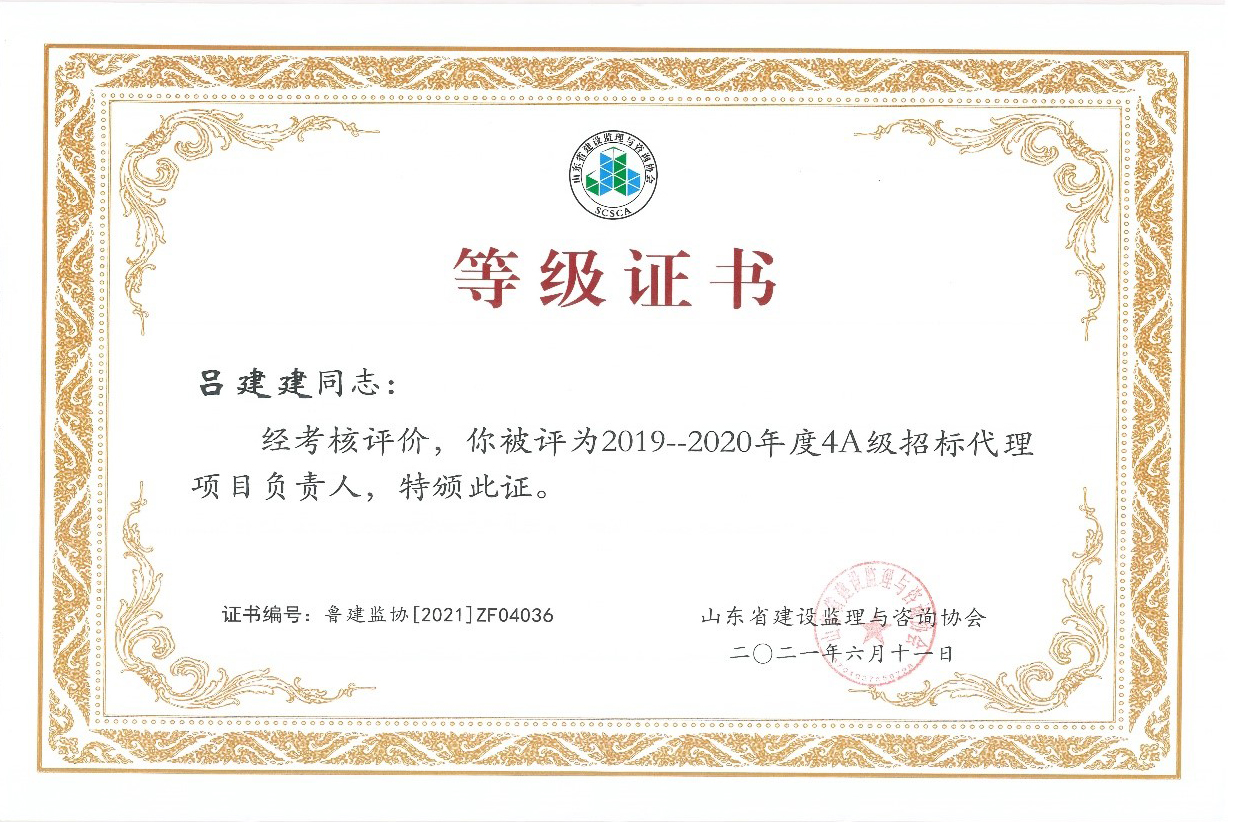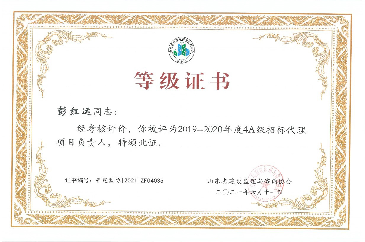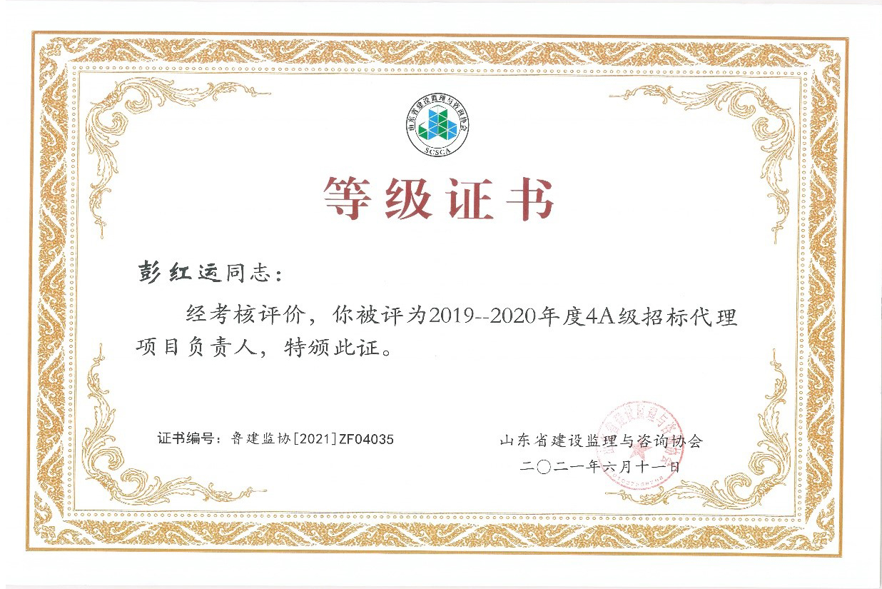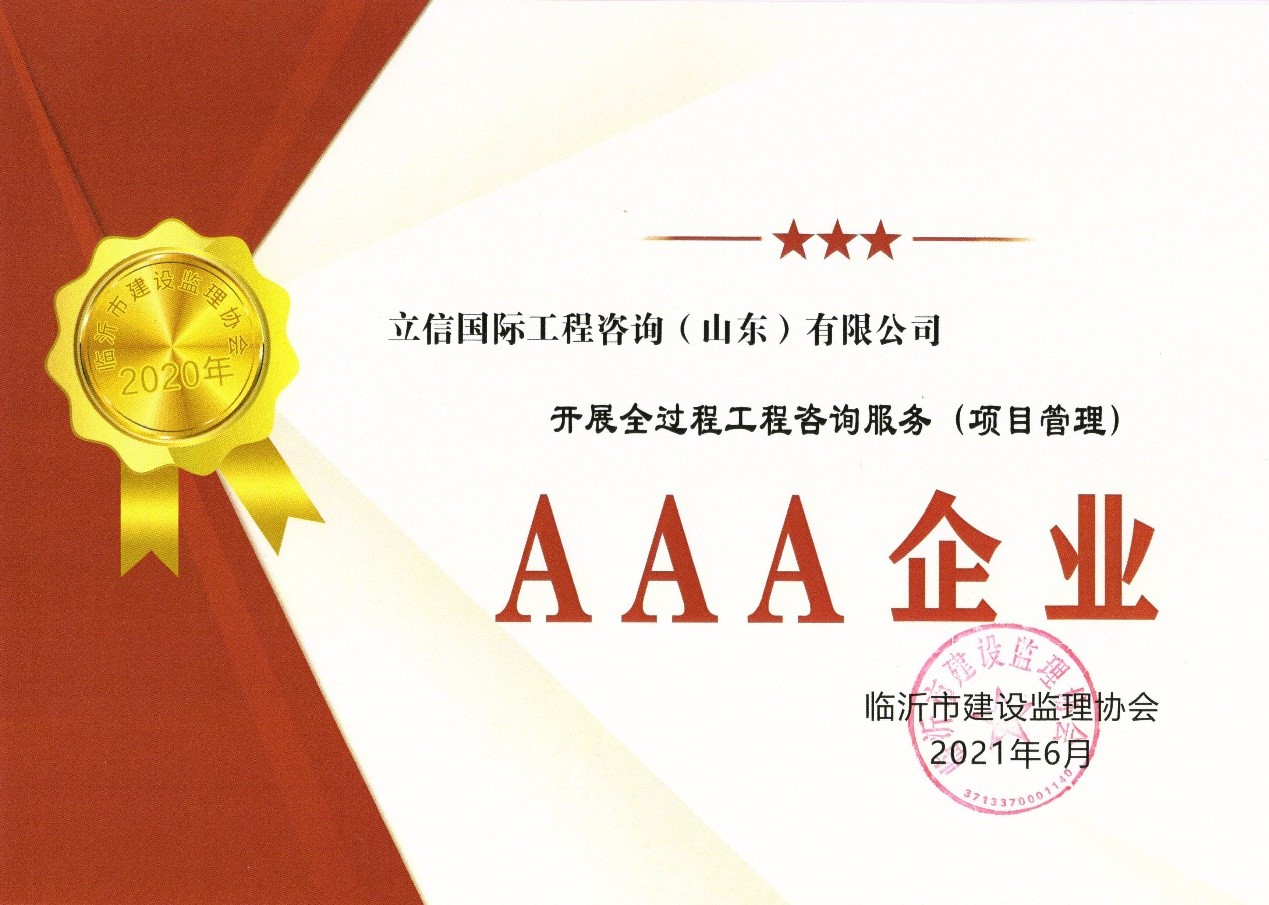 2021年6月,山東省建設(shè)監(jiān)理與咨詢協(xié)會(huì)、臨沂市建設(shè)監(jiān)理協(xié)會(huì)分別開展了有關(guān)全過程咨詢服務(wù)、監(jiān)理等業(yè)務(wù)的各項(xiàng)綜合考評(píng),立信國(guó)際工程咨詢(山東)有限公司在考評(píng)中獲得較高信用等級(jí)。 在山東省建設(shè)監(jiān)理與咨詢協(xié)會(huì)開展的2019-2020年度全過程咨詢服務(wù)業(yè)務(wù)會(huì)員單位考核評(píng)價(jià)工作中,我公司被評(píng)選為山東省首批5A級(jí)會(huì)員監(jiān)理企業(yè)、5A級(jí)會(huì)員招標(biāo)代理機(jī)構(gòu)、4A級(jí)全過程工程咨詢服務(wù)會(huì)員單位。 我公司員工多人被山東省建設(shè)監(jiān)理與咨詢協(xié)會(huì)評(píng)選為2019-2020年度先進(jìn),其中,馬海嘯、張傳增被評(píng)為5A級(jí)總監(jiān)理工程師,高宏、張傳增被評(píng)為5A級(jí)招標(biāo)代理項(xiàng)目負(fù)責(zé)人,呂建建、彭紅運(yùn)被評(píng)為4A級(jí)招標(biāo)代理項(xiàng)目負(fù)責(zé)人。