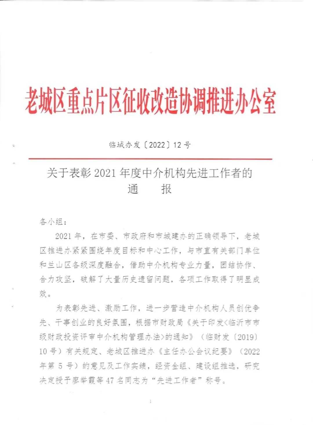 近日,臨沂市老城區(qū)重點(diǎn)片區(qū)征收改造協(xié)調(diào)推進(jìn)辦公室對2021年度中介機(jī)構(gòu)先進(jìn)工作者進(jìn)行了表彰,我集團(tuán)張森、隋金凱、劉霞、王甲玲、段德志、王友麗、諸葛奉云、孫運(yùn)艷共8名同志被授予“先進(jìn)工作者”榮譽(yù)稱號。 臨沂市老城區(qū)重點(diǎn)片區(qū)征收改造協(xié)調(diào)推進(jìn)辦公室負(fù)擔(dān)著我市老城區(qū)的征收改造和開發(fā)建設(shè)工作,我集團(tuán)作為改造建設(shè)工作的中介機(jī)構(gòu)秉承著獨(dú)立、客觀、公正的執(zhí)業(yè)準(zhǔn)則,積極開展財(cái)務(wù)審計(jì)、拆遷評估、預(yù)算編制、工程咨詢、造價(jià)咨詢等各項(xiàng)業(yè)務(wù)。多年來,我集團(tuán)各執(zhí)業(yè)機(jī)構(gòu)的工作人員始終堅(jiān)持以精益求精的專業(yè)精神、積極飽滿的工作熱情和嚴(yán)謹(jǐn)扎實(shí)的執(zhí)業(yè)作風(fēng)來開展各項(xiàng)工作,“同泰”集團(tuán)和“同泰”人先后多次獲得臨沂市政府、市住建局等政府部門和社會(huì)各界的表彰好評,為努力推動(dòng)臨沂市經(jīng)濟(jì)社會(huì)發(fā)展貢獻(xiàn)自己的專業(yè)力量。