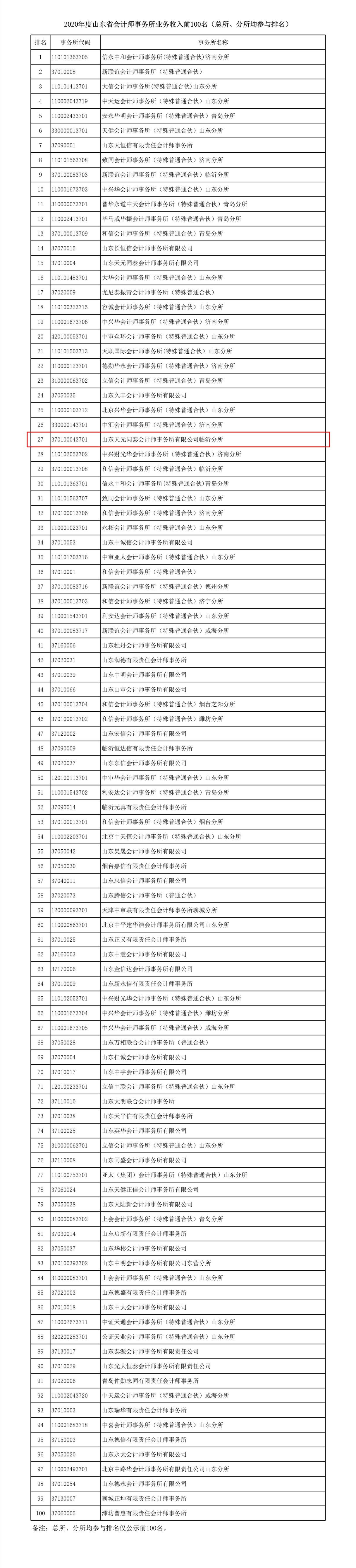原文鏈接:2020年度山東省會(huì)計(jì)師事務(wù)所業(yè)務(wù)收入前100名(總所、分所均參與排名) (sdicpa.org.cn)
